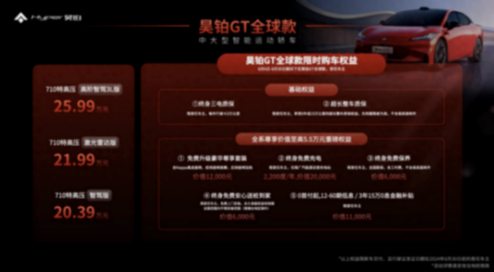 在6月6日,昊鉑GT全球款正式迎來上市,本次新車共推出3個(gè)車型版本,其指導(dǎo)價(jià)為20.39萬-25.99萬元,本次新車主要的升級(jí)的地方集中在智能駕駛上,而在新車首發(fā)期間,首任車主還能夠享受終身三電質(zhì)保、超長(zhǎng)整車質(zhì)保的基礎(chǔ)權(quán)益,以及免費(fèi)升級(jí)豪華尊享套裝等。