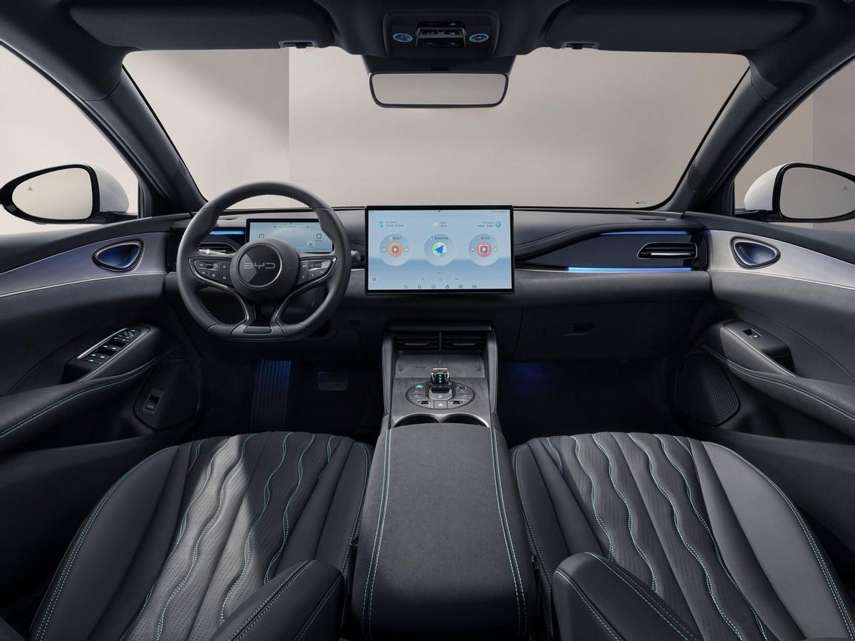 車內設計依舊是滿滿的比亞迪味兒,而且一看就知道是來自比亞迪海洋網的,跟外觀設計相比確實差點意思。話雖如此,但這套內飾的美觀度放在當下還是挺有競爭力的,只是稍微缺點兒新鮮感罷了。