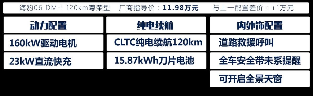 繼續往上選是海豹06 DM-i 120km尊榮型,跟上一配置車型對比,它的價格增加了一萬元,但不僅純電續航增加到120km,同時電機升級到160km,并且還增加了可開啟式全景天窗。顯然,這一萬元是花得物超所值的。