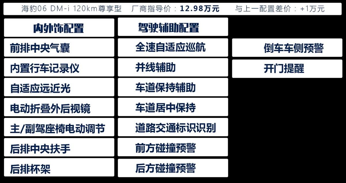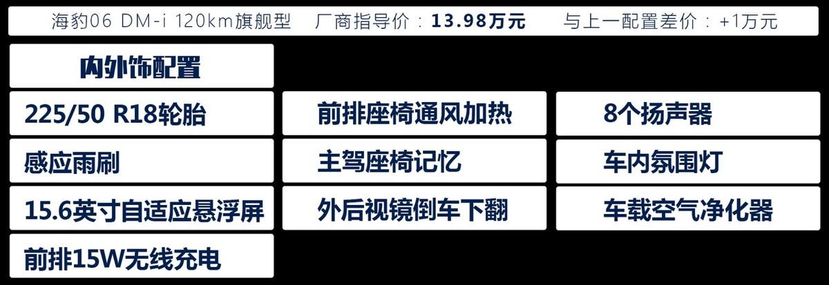 海豹06 DM-i 120km旗艦型是車系的頂配,售價是13.98萬元,相對上一配置車型貴了一萬元,但同時增加了十多項配置,主要以便捷性、舒適性配置為主,很符合那些對配置有較高要求,同時購車資金比較充裕的朋友。在我看來,它的性價比挺高的,但考慮到增加的配置更多是錦上添花,因此它的推薦度會相對低一些。