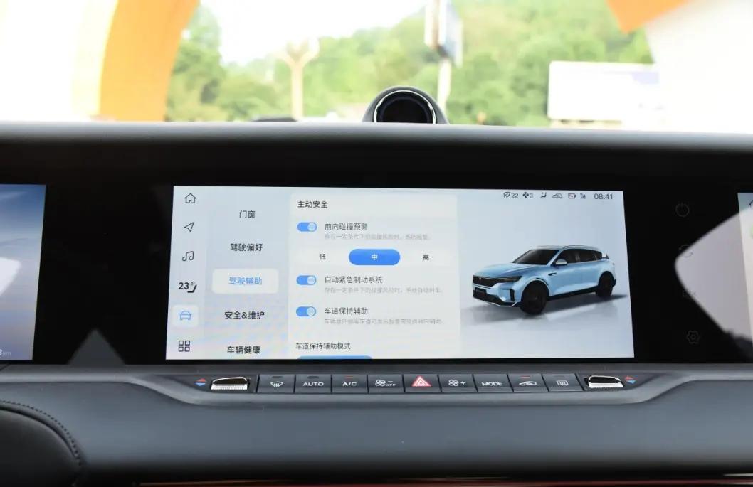 這款車的內飾看起來很干凈清爽,有三塊12.3英寸的屏幕,可以升降,感覺科技感很強。方向盤做工精致,按鍵布局也很好,握著很舒服。車里還有電子式懷擋設計,方便實用,前排還有50w無線充電,我手機支持快充,開車十分鐘手機就充了將近70%的電。車機裝了高通驍龍8155芯片,有128GB存儲空間,運行流暢,支持5G網絡,還有OTA升級、面部識別、聲紋識別、手勢控制等功能。