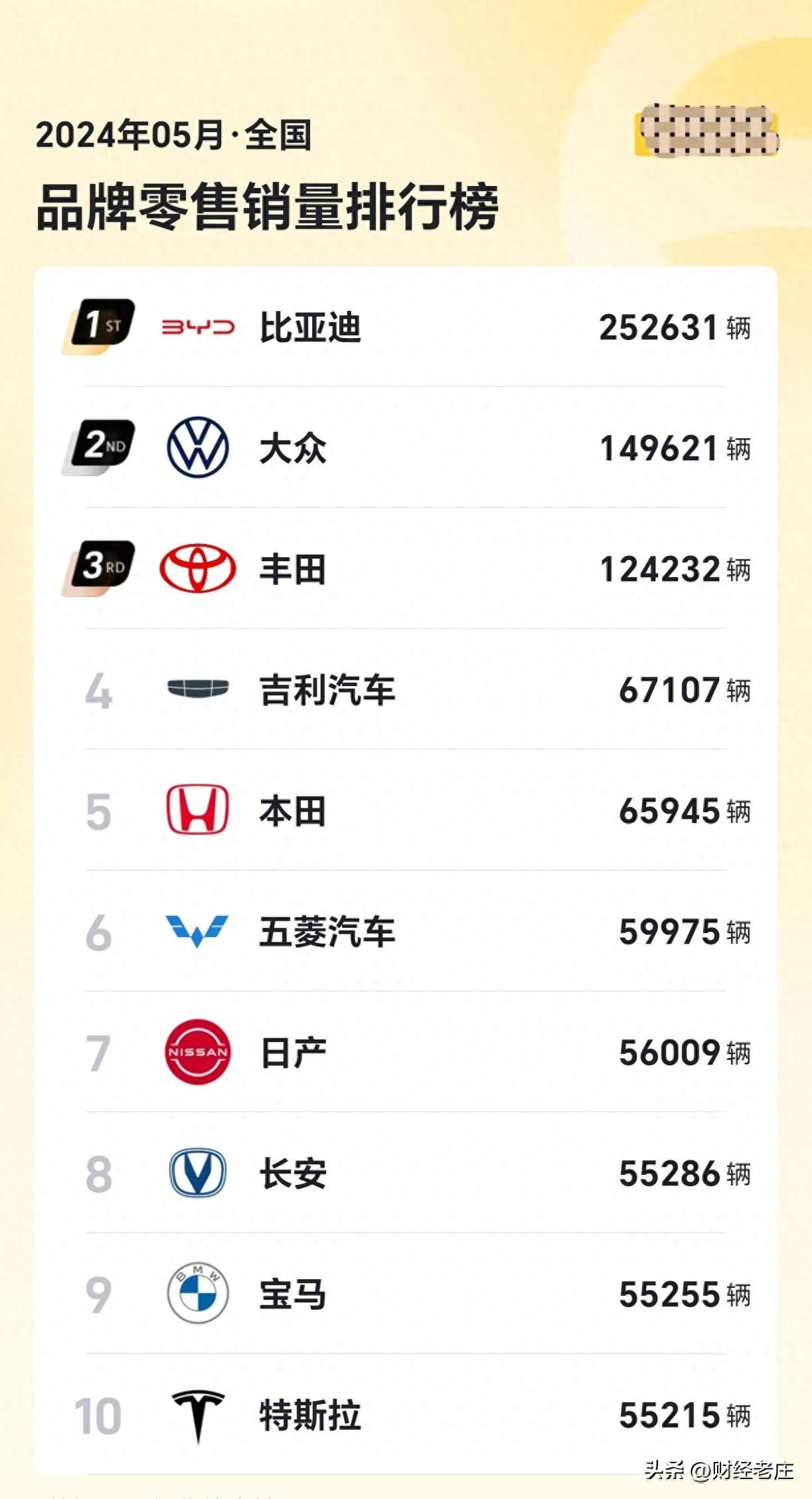 5月份各車企品牌銷量已經出爐,比亞迪、大眾和豐田依舊排名前三,吉利反超本田排名第四,特斯拉再次進入榜單位列第十。