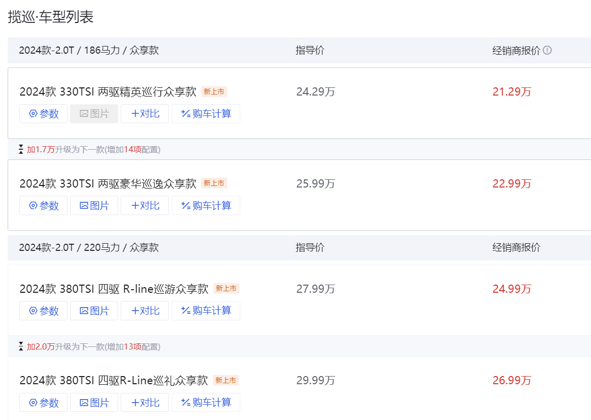 近年來,SUV市場持續(xù)火熱,其寬敞的空間和良好的通過性深受消費者喜愛。在眾多SUV中,6月7日上市的一汽-大眾攬巡眾享款憑借出色的產(chǎn)品力和誘人的優(yōu)惠政策,吸引了不少消費者的目光。一汽-大眾攬巡眾享款共推出4款車型,指導價24.29萬-29.99萬,據(jù)(廣州、深圳、上海、成都)地區(qū)終端顯示,經(jīng)銷商報價21.29萬元起,優(yōu)惠幅度達3萬,如此性價比,讓人不禁心動。那么,這款車的實際表現(xiàn)如何呢?帶勁不?接下來,以攬巡 2024款 380TSI 四驅(qū)R-Line巡禮眾享款(優(yōu)惠后26.99萬元)為例為大家?guī)碓敿毜捏w驗報告。