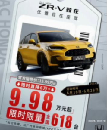 這就是今天要說的主角——廣汽本田ZR-V致在。近日,廣汽本田開啟“6·18購物節狂歡”。廣汽本田ZR-V致在限時購車優惠超6萬元,優惠后汽油版車型9.98萬元起,混動版則為11.98萬元起。不過呢,凡是好消息好像都要加一個不過,這樣的優惠政策全國限量618臺。