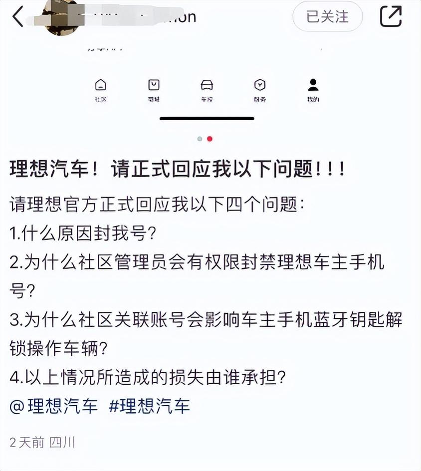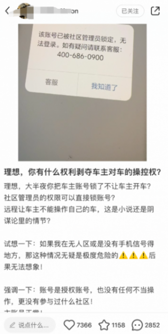 最近,一個理想MEGA車主在網上吐槽:自己的車突然就動不了了!原因是他的車賬號被鎖了。他曬出一張截圖,顯示賬號被社區管理員給封了,自己怎么登也登不進去。這位車主還特意強調了一下,自己是全款買車的,平時也沒在網上發過啥出格的言論。