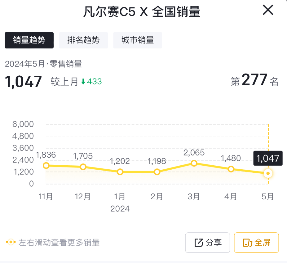 顯然,從銷量規模上看,2024年5月份,凡爾賽C5 X單月僅1000臺出頭的銷量規模,與上市之初形成了較大的反差。
