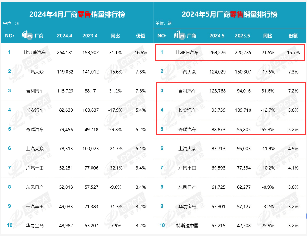 6月12日,乘聯會最新數據顯示,2024年5月份,比亞迪汽車、吉利汽車、長安汽車、奇瑞汽車依然是國內自主車企四強。而且,這四家車企均進入了5月份國內車企零售銷量前5名,表現強勢。至于其他自主車企的表現,則相對遜色了不少。