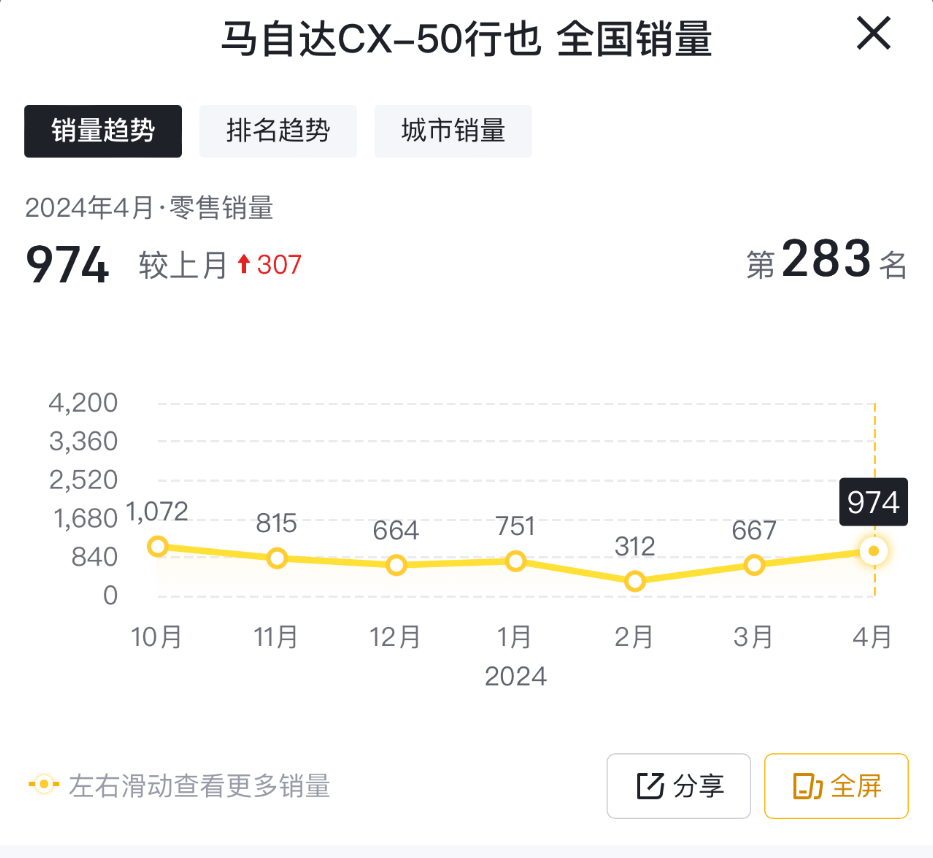 最新行業綜合銷量數據顯示,2024年4月份,馬自達CX-50行也的單月零售銷量為974臺。