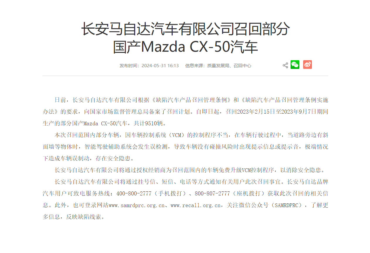據了解,本次召回的車型,主要為2023年2月15日至2023年9月7日期間生產的部分國產Mazda CX-50汽車。