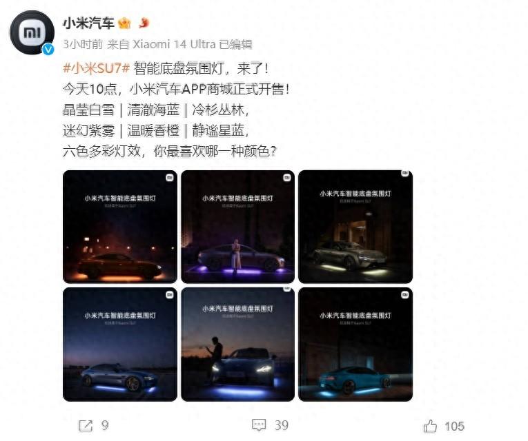 現如今,新能源汽車可以說是受到了越來車迷朋友們的關注,其中,小米汽車作為新晉的造車勢力,盡管目前只推出了1款車型—小米SU7,但是,它憑借強大的品牌影響力,加上小米SU7年輕動感的外觀設計,以及較為不錯的動力性能表現,瞬間使它火遍了大江南北,自上市以來,銷量方面也還較為出色,上個月(5月份),小米SU7月銷量更是達到了8646輛,由此可見,車迷朋友們對于它的喜愛程度。近日,小編從小米汽車官方獲悉,小米SU7智能底盤氛圍燈6月28日10點正式開售,售價999元,對于這樣的選裝配置, 不知道你們有何看法?下面就跟隨小編一起來了解一下吧。