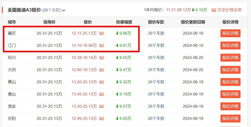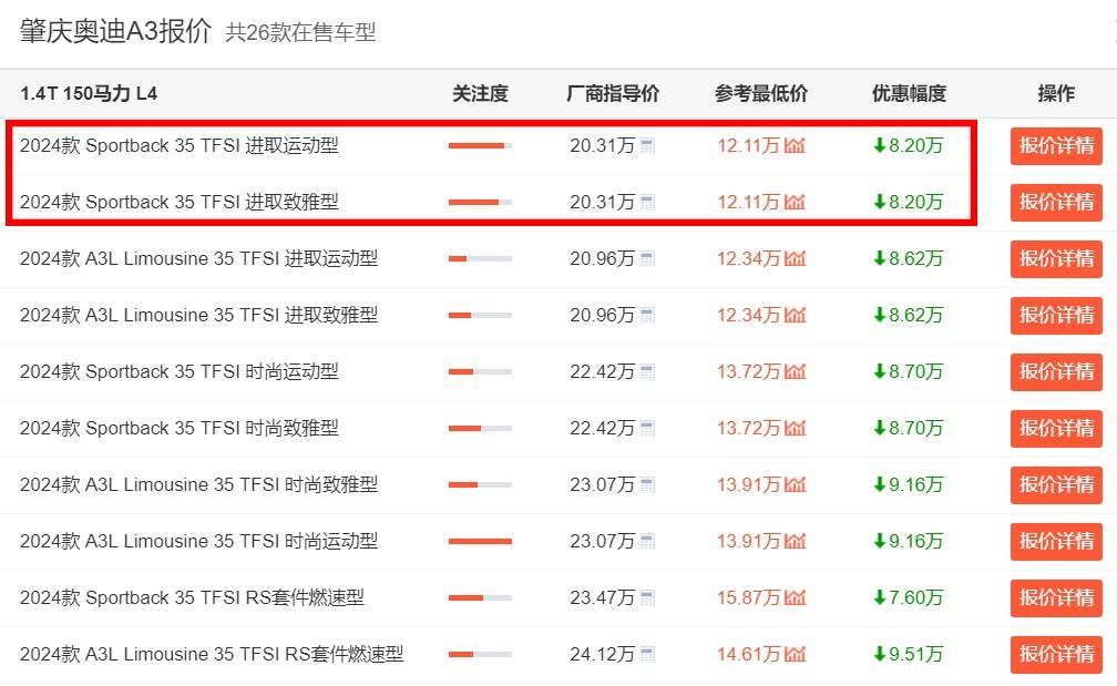不過,眼下這代奧迪A3的優惠還是挺大的,就以廣東肇慶地區所給出的奧迪A3車型報價來說,奧迪A3現在便已經出現了最高9.86萬元的優惠降幅。而優惠完之后,新車的最低參考報價也已經來到了12.11萬元起步,怎么樣,花12萬多的裸車價格就能買到一臺奧迪A3,這吸引力是不是也并不差呢?