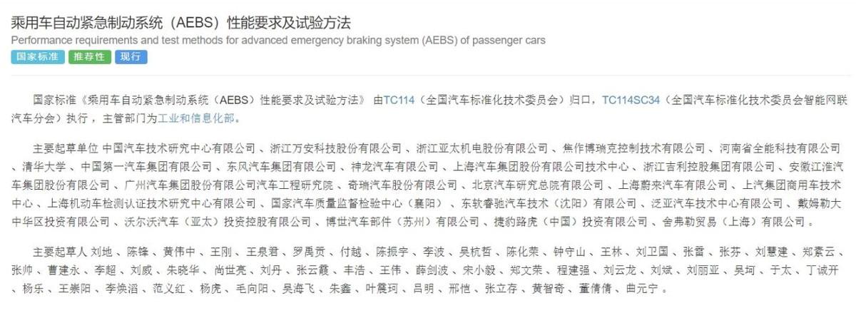 目光再回到國內。國家標準GB/T 39901-2021《乘用車自動緊急制動系統(AEBS)性能要求及試驗方法》對車輛的AEB功能提出了要求。而起草這份標準的單位涉及汽車科研機構、車企、供應商等。其中涵蓋了一汽、上汽、廣汽、北汽等主流車企,并且還出現了新勢力品牌蔚來。