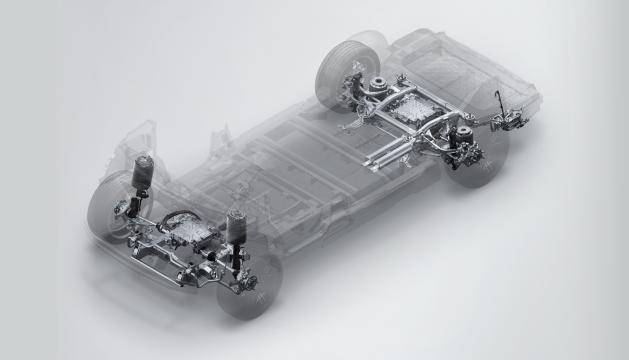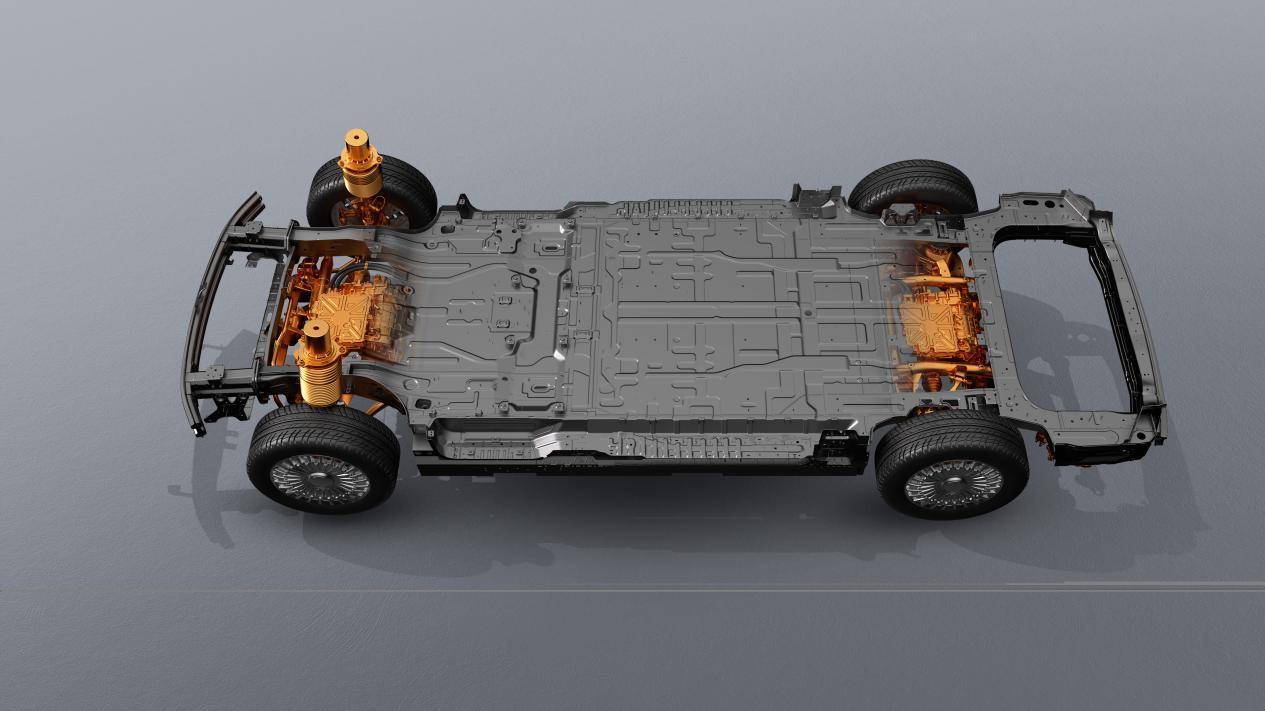 在車輛后部,為了同樣做到純平地板,SOA架構將后懸縱梁上置改為下置,并將后懸架彈簧托盤最大化靠近輪邊,使后懸架杠桿比達到0.675,較同級平均高出25%。這使得不僅車內空間更大,還能讓該架構可兼容空懸、CDC與后置電機等配置,確保車輛的豪華、舒適屬性。