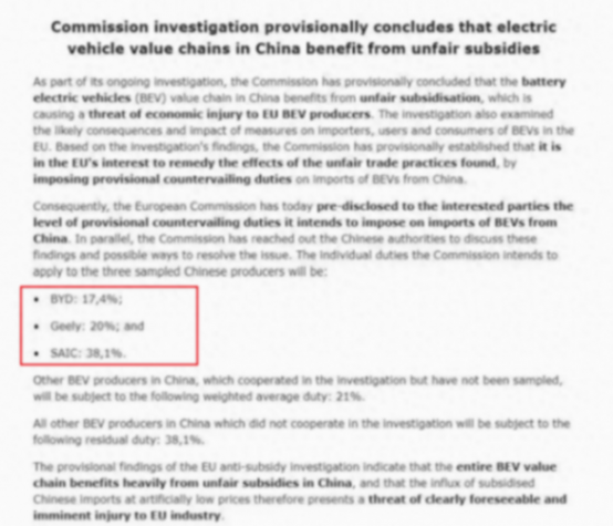 歐盟的規(guī)定是這么說的,除了比亞迪、吉利和上汽這三家之外,其它配合調(diào)查的車企,平均加征21%的關(guān)稅,其他不配合調(diào)查的車企,平均加征38.1%的關(guān)稅。