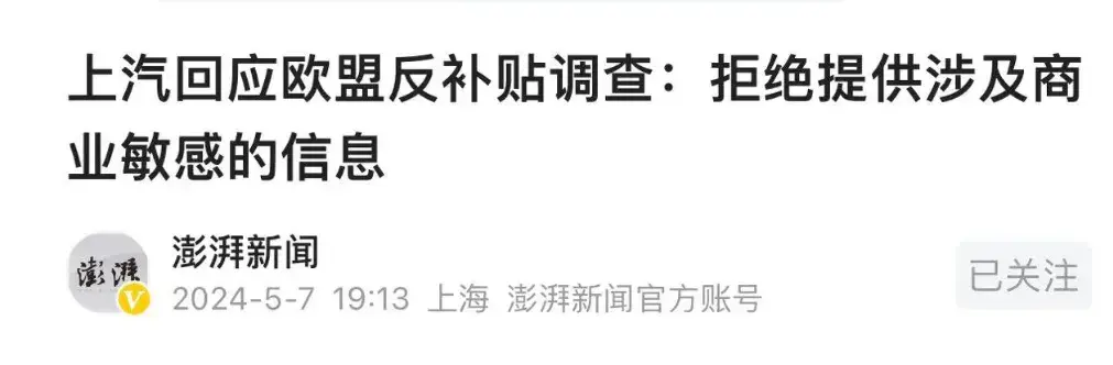 于是,歐盟也就把上汽列為了不配合調(diào)查的車企,頂格的懲罰性關(guān)稅就不意外了。