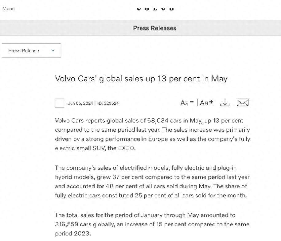 最近,沃爾沃公布了5月的銷售數(shù)據(jù),全球銷量為68034輛,同比增長(zhǎng)13%,新能源銷量為32768輛,同比增長(zhǎng)37%,占比達(dá)48.16%。從電驅(qū)化的速度來說,沃爾沃在豪華品牌中算是轉(zhuǎn)型比較快的。