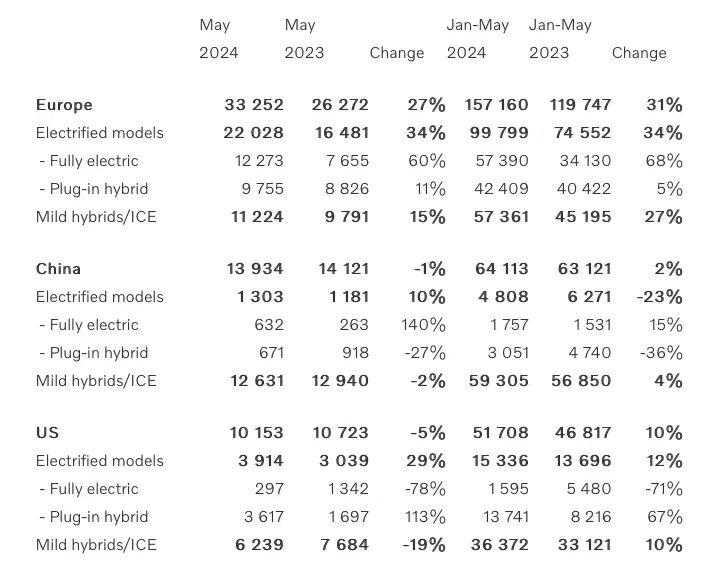 歐洲市場(chǎng)依然是沃爾沃的銷量主力,5月售出33252輛,同比增長(zhǎng)達(dá)27%,其中,新能源車銷量為22028輛,同比增長(zhǎng)34%,1-5月,新能源累計(jì)銷量為99799輛,同比增長(zhǎng)34%。可以看出,沃爾沃的新能源車基本都被歐洲市場(chǎng)吸收了。