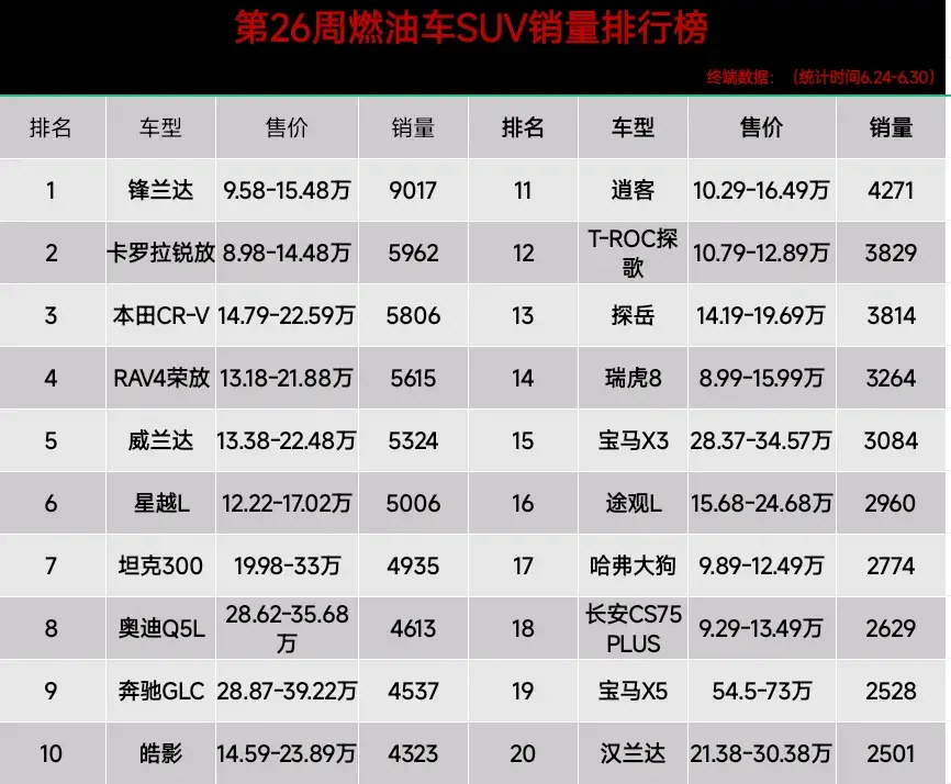 第26周燃油車SUV銷量排行榜卡羅拉銳放亞軍、威蘭達(dá)第5