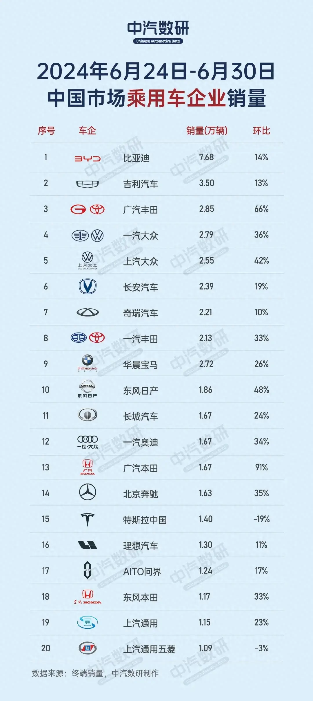 近年來,中國汽車市場持續繁榮,多數車企銷量屢創新高。消費者購的買力不斷提升,對高品質、高性能轎車的需求日益旺盛。最新中汽數研公布了24年第26周品牌銷量排行榜(6月24日至6月30日)。比亞迪以7.68萬輛的銷量穩居榜首廣,汽豐田、一汽大眾和上汽大眾分位列第三至第五位。官宣!24年第26周銷量榜,比亞迪以7.68萬輛穩居榜首,環比增長14%。