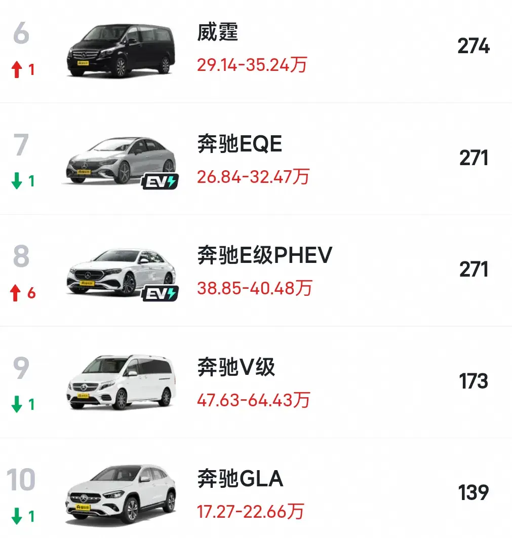 而外后各車銷量表現一般,其中奔馳A級銷量559輛,排在第5。威霆銷量274輛,排在第6、奔馳EQE銷量271輛,排在第7。奔馳E級PHEV銷量271輛,排在第8。奔馳V級銷量173輛,排在第9。奔馳GLA銷量139輛,排在第10。