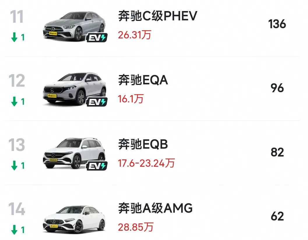 而10名開外車系銷量慘淡,其中奔馳C級PHEV銷量僅136輛,排在第11。奔馳EQA銷量跌破至96輛,排在第12。奔馳EQB銷量82輛,排在第13、奔馳A級AMG更是銷量僅僅62輛,排在第14。