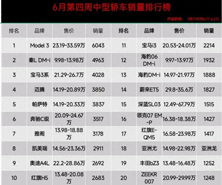 中型車市場火熱,其大空間及性能優越深受歡迎,6月第四周中型轎車銷量排行榜出爐,Model 3銷量達6043奪得冠軍,秦L DM-i、寶馬3系、緊隨其后位列前三,奔馳C級、凱美瑞、奧迪A4L、紅旗H5、入圍前十名。寶馬i3、海豹DM-i、領克07 EM-P、均無緣前十之列。數據如下:官宣:6月第四周中型轎車銷量榜:奔馳C級跌出前三