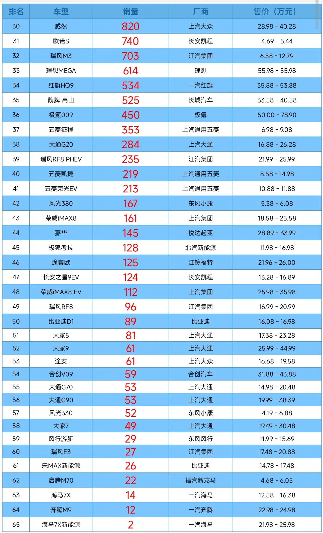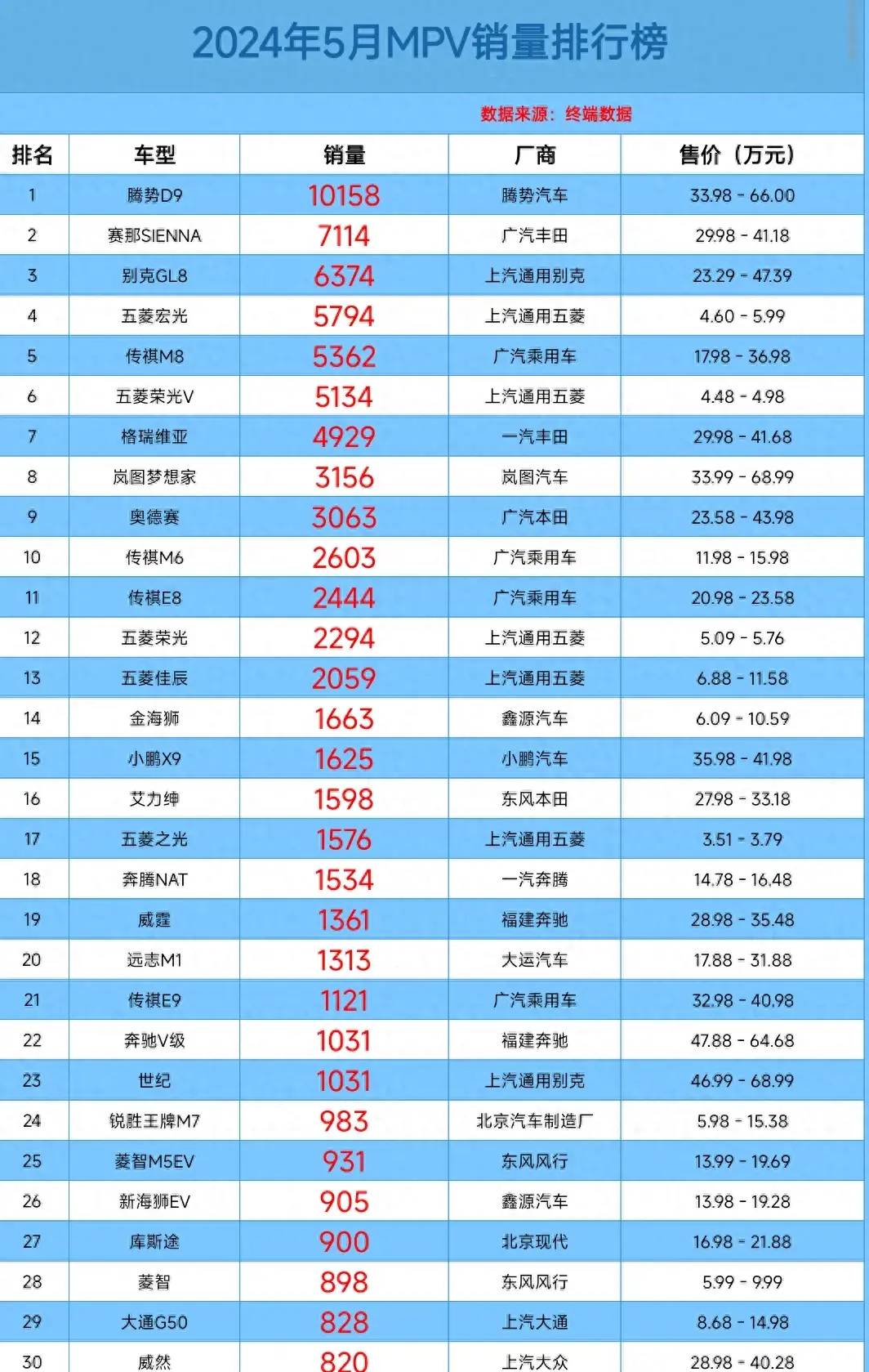 而剩余前三十名中,傳祺M8銷量為5362輛、格瑞維亞銷量為4929輛、傳祺M6銷量為2603輛、五菱佳辰銷量為2059輛、艾力紳銷量為1598輛、威霆銷量為1361輛。