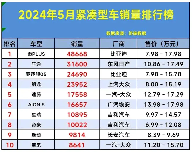 乘聯(lián)會(huì)發(fā)布了2024年5月緊湊型車銷量排行榜 。而其中秦PLUS、軒逸、驅(qū)逐艦05、表現(xiàn)最佳,分別獲得前三名,銷量均突破24690輛、而速騰、第5、帝豪、第8、大眾ID.3第16、凌渡第21。