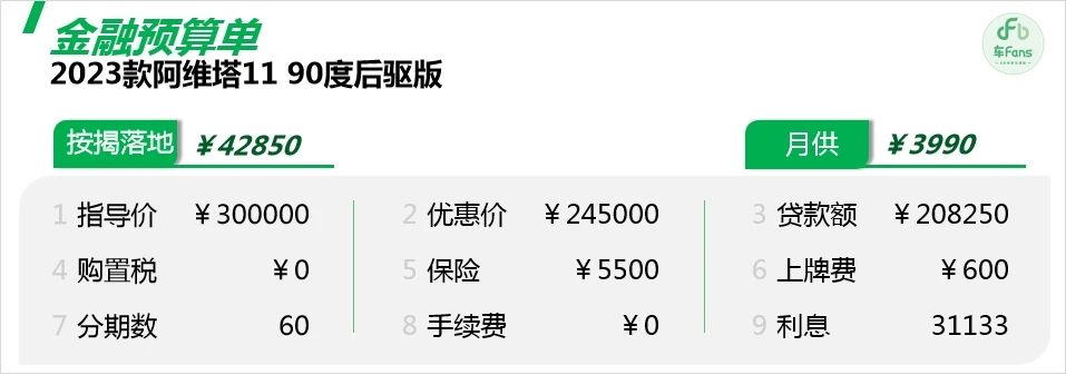 以23款標(biāo)配為例,首付15%、分期5年、年華費(fèi)率2.99%,為大家做個(gè)金融預(yù)算單: