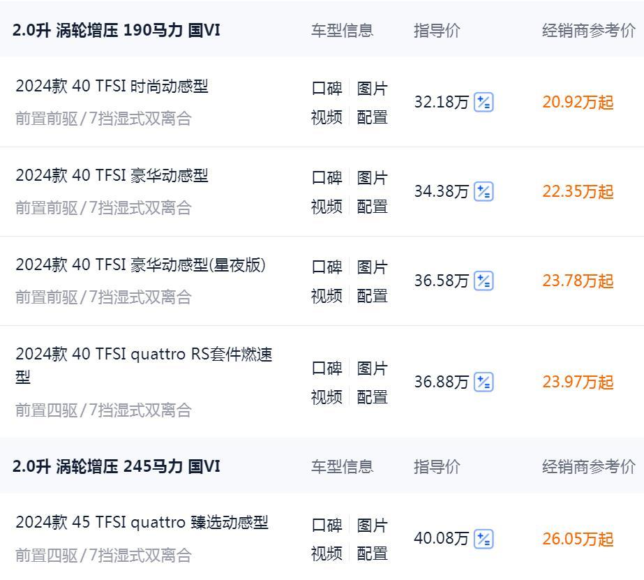 毫無疑問,奧迪A4L是奧迪在國內市場最重要的車型之一,這款車的知名度、被認可度,我們相信大家也都知道。目前2024款車型廠商指導價為32.18—40.08萬元,但是這款車目前的終端優惠還是比較可觀的,我們看到目前新款車型的終端售價最低可以壓到20.9萬元左右,優惠幅度還是相當大的。