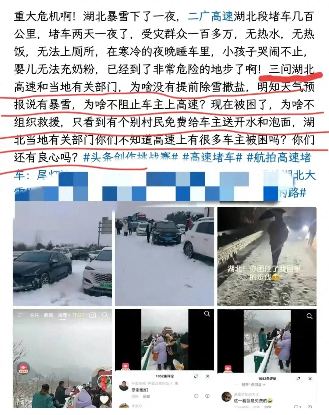 寒風(fēng)凜冽,湖北大雪覆蓋了京港澳高速湖北路段。數(shù)百公里的車龍成了被困者的家,人們陷入了三天的無邊無際的等待。寒冷的天氣讓生存變得艱難,沒有熱水、暖飯,無法如廁,嬰兒孩子們更是無法享受到熱水沖奶粉的溫暖。
