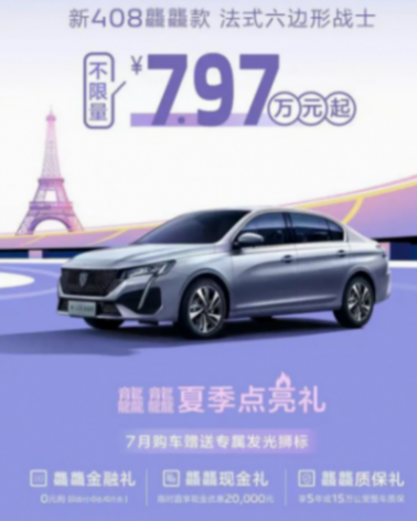 東風標致近日宣布,旗下新408龘龘款車型在7月1日至7月31日期間推出特別的夏季優惠活動。該車型將以驚人的7.97萬元起售價限時銷售,這一價格比官方指導價低了3萬元,相當于以7.2折的優惠價格提供給客戶。此優惠不僅適用于全款購車,貸款購車同樣享受此優惠。此外,購車客戶還可以獲得三重禮遇,包括贈送專屬發光獅標。