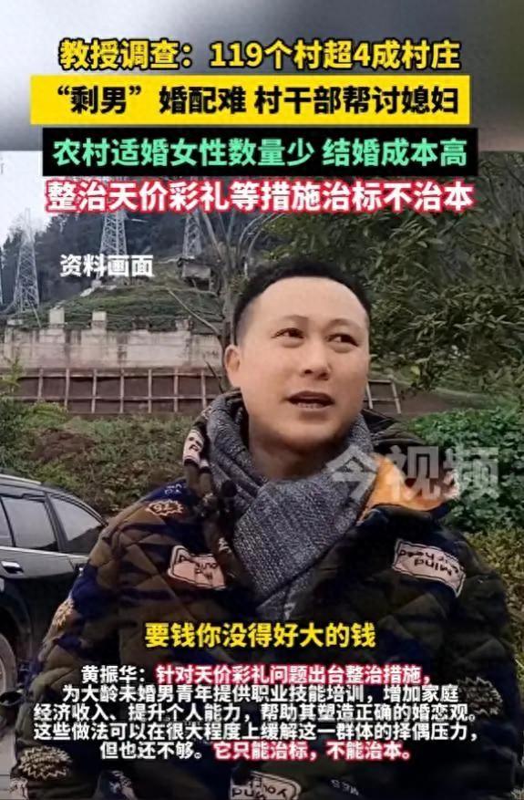近期研究發(fā)現(xiàn),許多村莊內(nèi)的年輕男性尚未結(jié)婚。針對這個現(xiàn)象,黃教授進行了深度分析,他表示這其實是由多種復雜的社會問題引發(fā)的,包括“一少一高三低”,其中最突出的是適婚女性數(shù)量相對較少,由此抬高了婚嫁門檻;另外,個人和家庭收入水平較低、教育程度不夠以及對傳統(tǒng)婚戀觀接受度低等也是制約的原因。