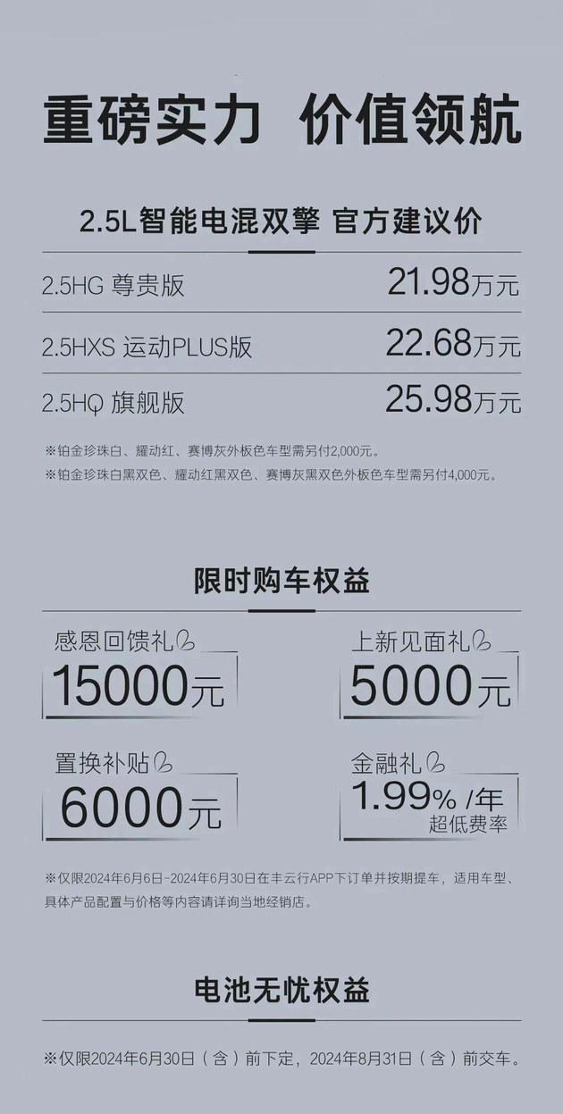 6月6日,廣汽豐田第九代凱美瑞(搭載2.5L混動系統(tǒng)的車型)正式上市,共推出3款配置,售價區(qū)間為21.98-25.98萬元。