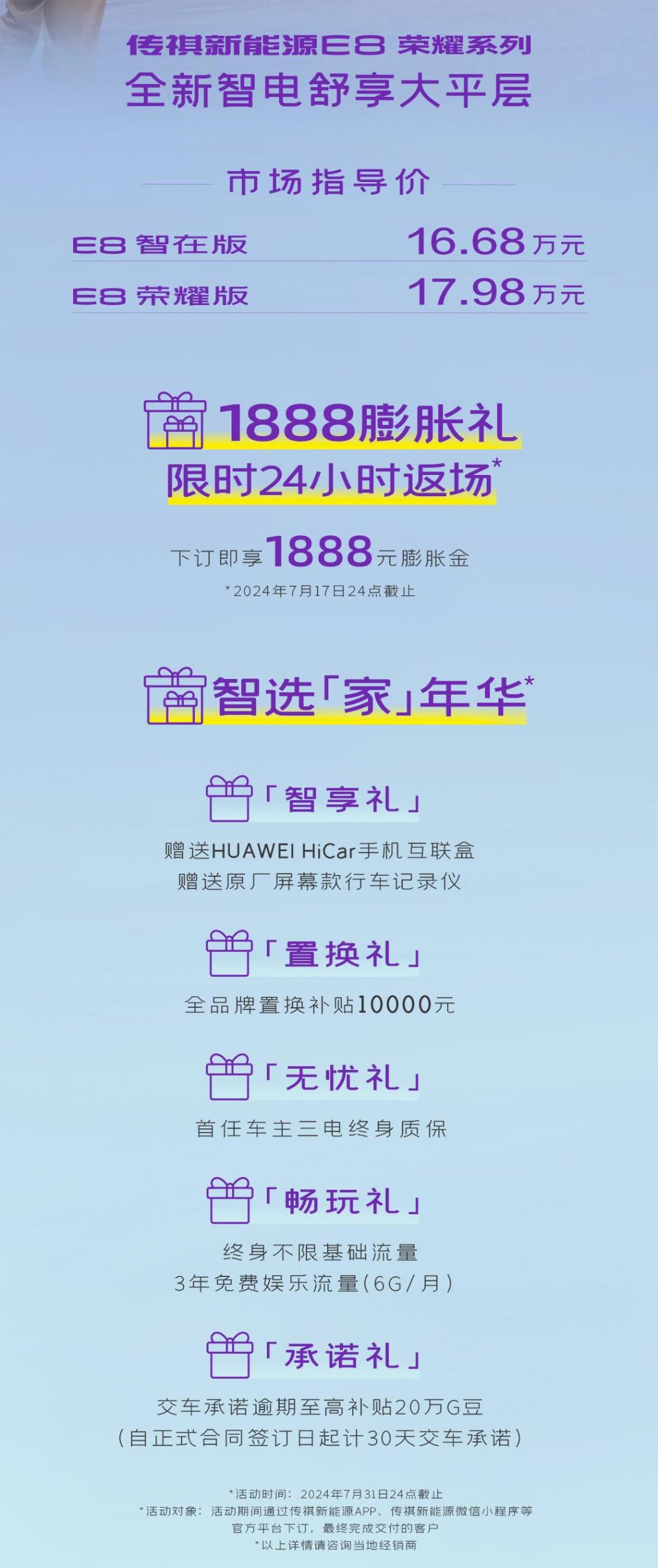 與此同時,在7月17日24點前下訂的用戶還可享受1888元膨脹金,并且在7月31日24點前購車的用戶還可享受智享禮、置換禮、無憂禮、暢玩禮和承諾禮等多項專屬購車福利政策。
