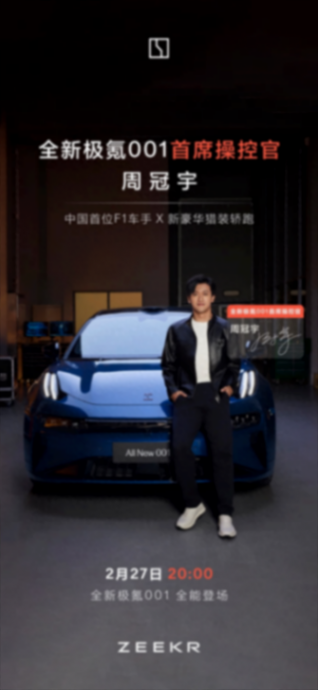 周冠宇是中國首位F1車手,并在 F1 初登場就獲得積分,作為中國F1第一人,周冠宇在F1賽場拼盡全力突破速度的極限,揮灑著中國新生代的自信與力量。而作為極氪的第一款車型,極氪001是純電獵裝品類的開創者,上市3年以來持續蟬聯30萬以上純電車型銷冠寶座,不斷刷新新能源行業的冠軍記錄,更憑借豪華純電標桿實力,5次突破吉尼斯世界紀錄,成為中國新能源汽車品牌的最佳代表。2月27日,全新極氪001將煥新而來,正式開啟獵裝2.0時代。