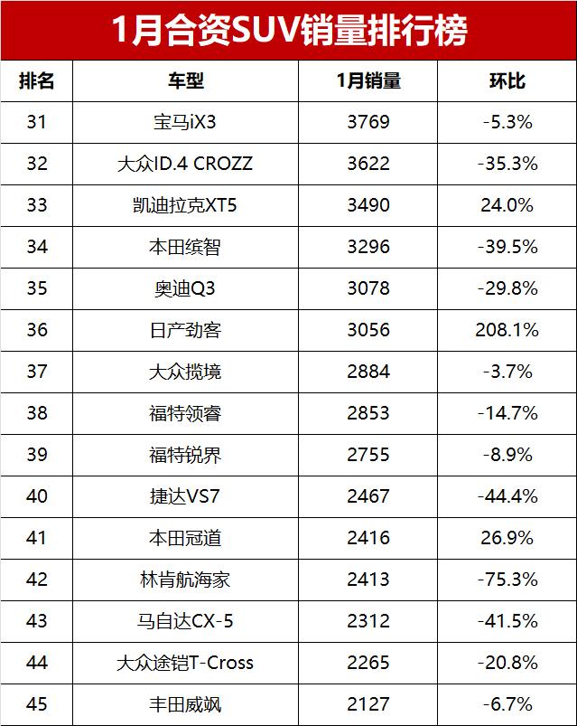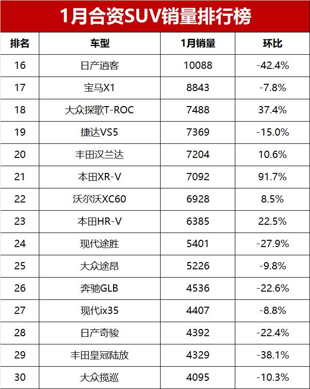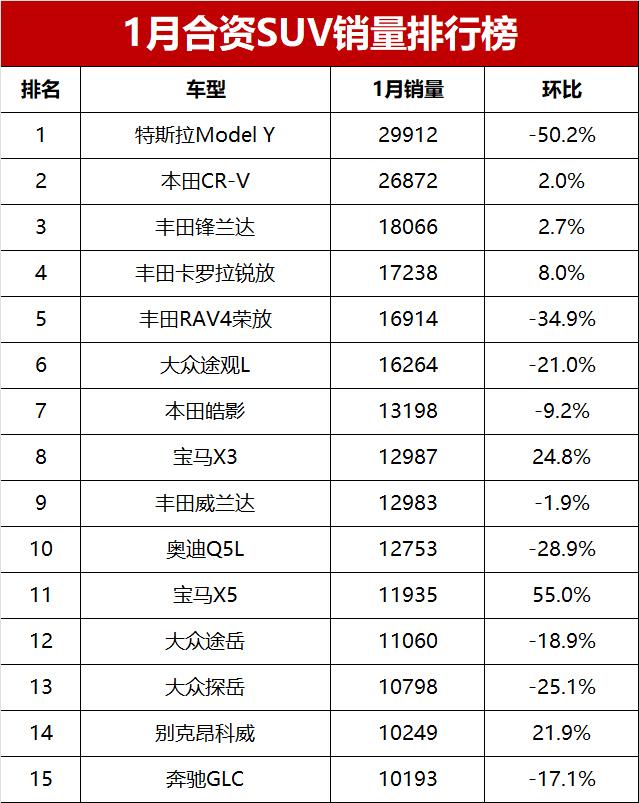 據乘聯會日前公布的銷量數據,2024年1月合資品牌SUV市場零售銷量為41.7萬輛,同比增長61.3%,在乘用車市場上的份額為20.5%。與去年12月的50.5萬輛相比,環比下跌17.4%。1月合資SUV銷量榜!本田CR-V第2,漢蘭達第20,冠軍銷量腰斬!