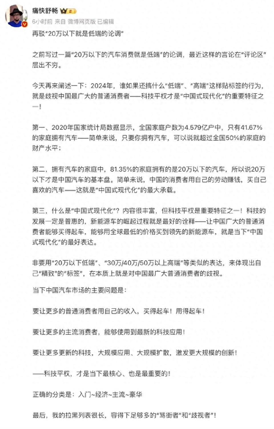微博大V痛快舒暢發了個微博,義憤填膺的說,我要駁斥:20萬以下的汽車是低端的論調。