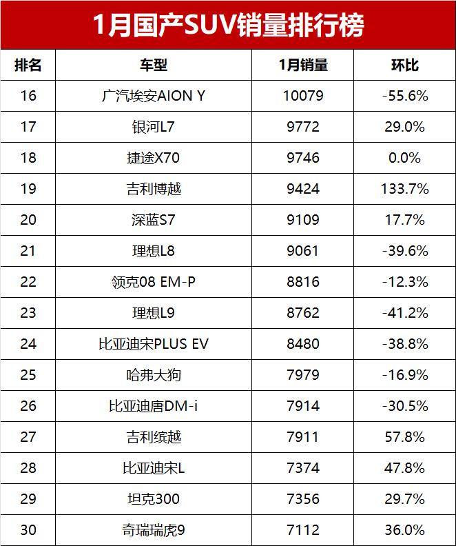 哈弗大狗、比亞迪唐DM-i、吉利繽越、比亞迪宋L、坦克300、奇瑞瑞虎9等六款車型排名第25至第30位,銷量都達到7000+輛的水平。其中,上市不久的比亞迪宋L,銷量為7374輛,排名第28位。