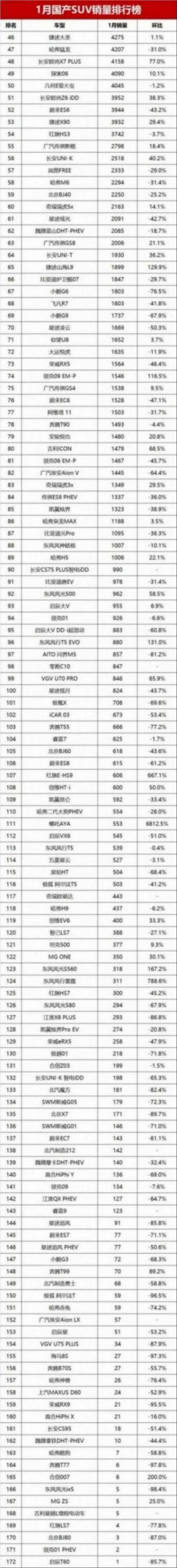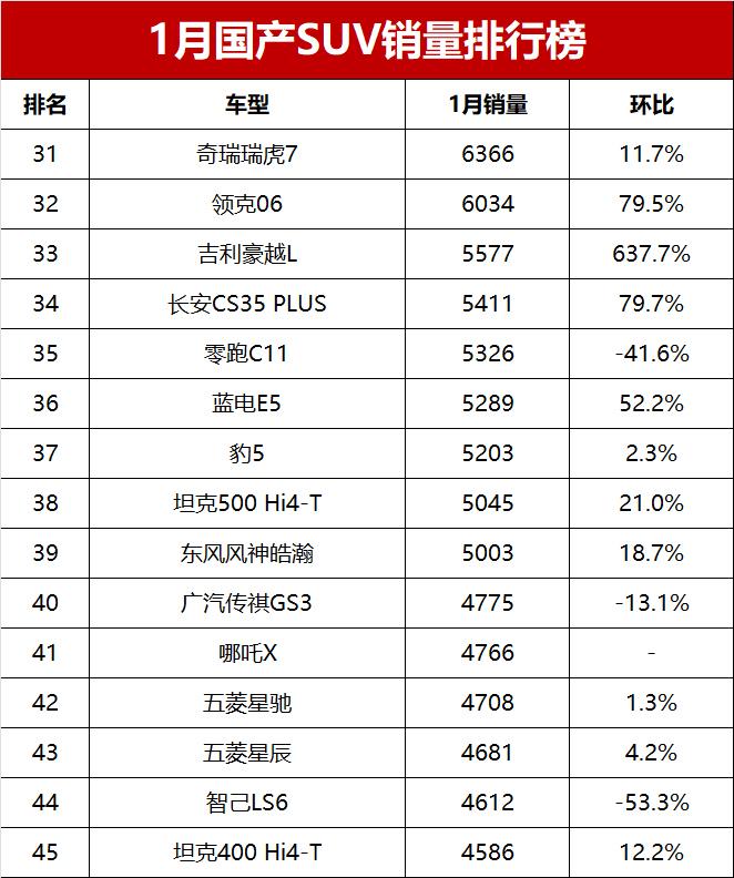吉利豪越L、長安CS35 PLUS、零跑C11、藍電E5、豹5、坦克500 Hi4-T、東風風神皓瀚等七款國產SUV銷量都達到5000+輛的銷量,排名第33至第39位。其中,上市不久的方程豹豹5銷量為5203輛,排名第37位;風神皓瀚1月銷量5003輛,排名第39位。