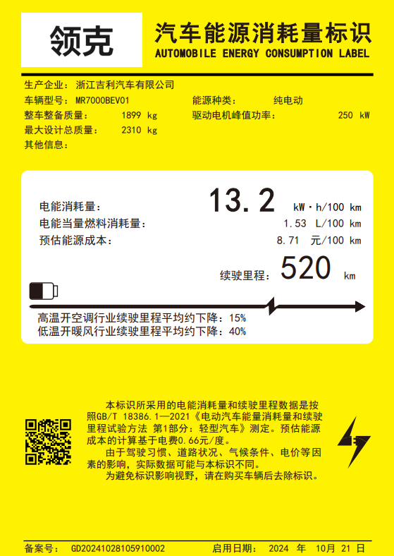 動力方面,之前在工信部申報的車型采用單電機設計,電動機型號為TZ220XYA01,生產企業是衢州極電電動汽車技術有限公司,動力電池為磷酸鐵鋰鋰離子電池,生產企業為衢州極電新能源科技有限公司。動力方面,電動機的最大功率為250kw,其百公里耗電量為13.2 kW·h,純電續航里程520公里。其姊妹車型極氪X兩驅版的純電續航里程分別為420km和560km,動力電池方面,420km車型采用瑞浦蘭鈞的磷酸鐵鋰電池,而560公里車型的三元鋰電池來自時代吉利。