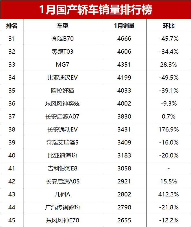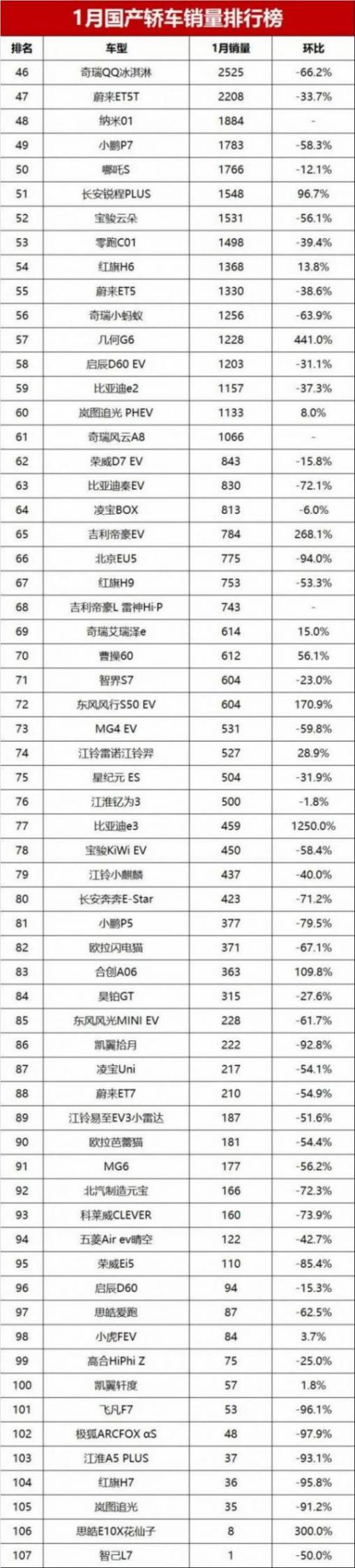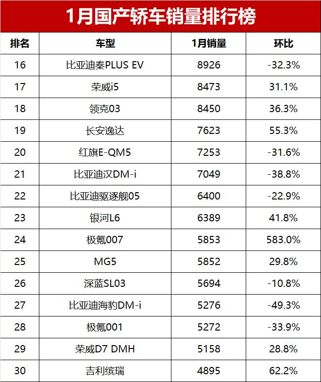 1月國產(chǎn)轎車銷量榜!星瑞奪亞軍,海豚僅第七,漢DM跌出前二十