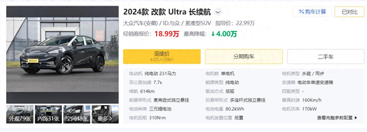 對于家庭用車來說,性價比,空間,品質感,用車成本,一定是消費者購車的重點考慮因素,如果你對以上幾點較為在意的話,我想大眾ID.與眾 改款 Ultra 長續航版會是個不錯的選擇,該車型定位純電緊湊型SUV,續航里程達到了614公里,優惠后的價格為18.99萬元,那么它的產品力怎么樣呢?