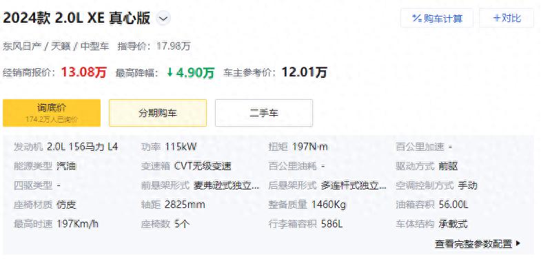 在多年之前,說起合資B級車,其大多數的價格基本都在20萬元左右,這個價格即使放在現在,也讓很多普通消費者望而止步,但是面對國內競爭越來越激烈的大環境,這些曾經價格高昂的合資B級車在價格上也做出了很大程度的下探,就比如今天我們為大家帶來的這款日產天籟真心版,該車目前在終端方面便有著3.9萬元的價格優惠,其優惠之后的價格僅為13.08萬元,顯然這個價格還是比較有誘惑力的,那么這臺日產天籟真心版夠“真心”嗎?讓我們接著往下看。