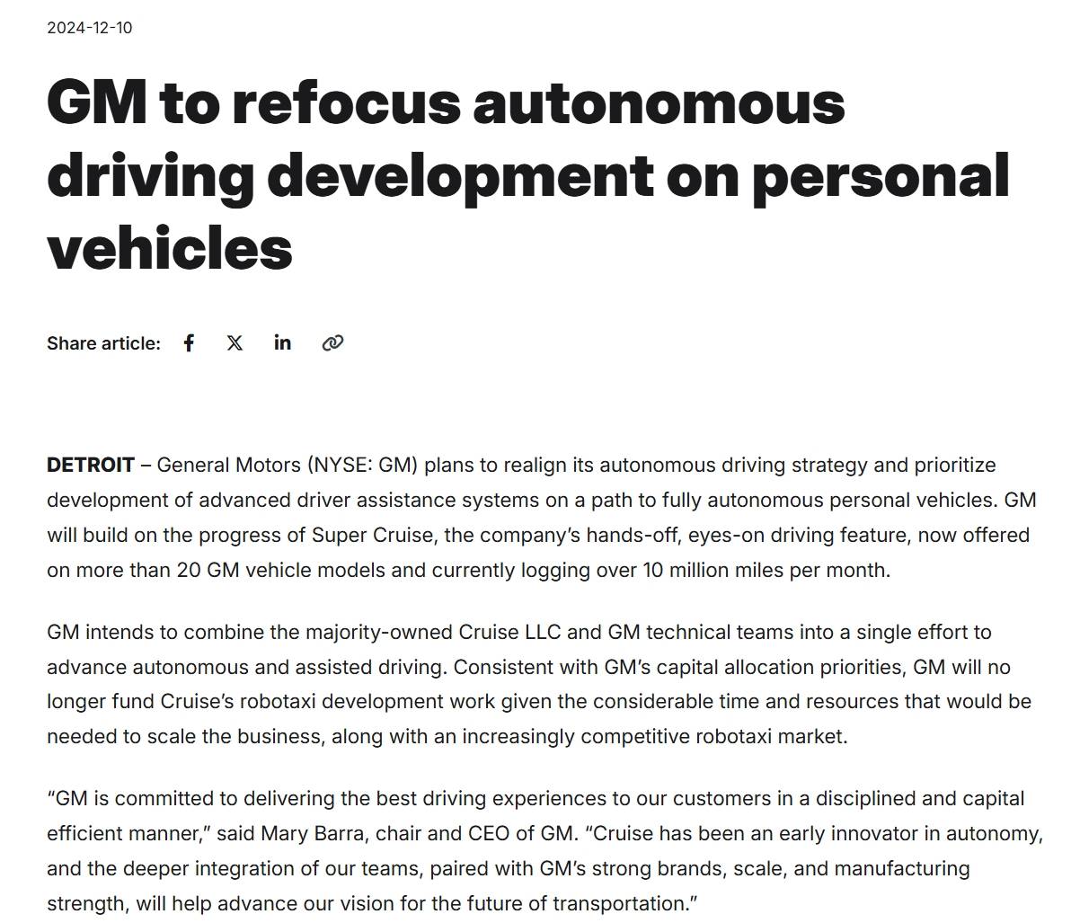 12月10日,通用汽車在官網(wǎng)發(fā)布公告稱,將重新調(diào)整自動(dòng)駕駛戰(zhàn)略,優(yōu)先開發(fā)輔助駕駛系統(tǒng)。通用控股的自動(dòng)駕駛公司Cruise將與通用技術(shù)團(tuán)隊(duì)整合,共同推動(dòng)自動(dòng)駕駛和輔助駕駛技術(shù)的發(fā)展。同時(shí),通用將不再為Cruise的Robotaxi(自動(dòng)駕駛出租車)業(yè)務(wù)提供資金與車輛。