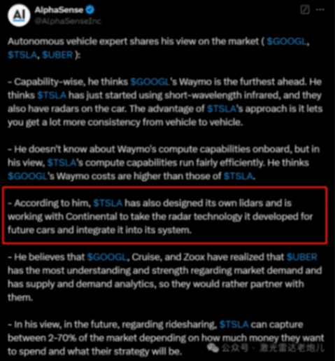 一位行業專家對此發表了自己的見解。他認為,在自動駕駛技術方面,Google旗下的Waymo處于領先地位,尤其是在能力上遠超其他競爭對手。盡管特斯拉才開始使用短波紅外線技術,并且其車輛同樣配備了雷達,但特斯拉的方法能夠顯著提升車輛之間的一致性。對于Waymo的車載計算能力,這位專家表示并不了解,但他認為特斯拉的計算效率非常高,相比之下,Waymo的成本要高出不少。