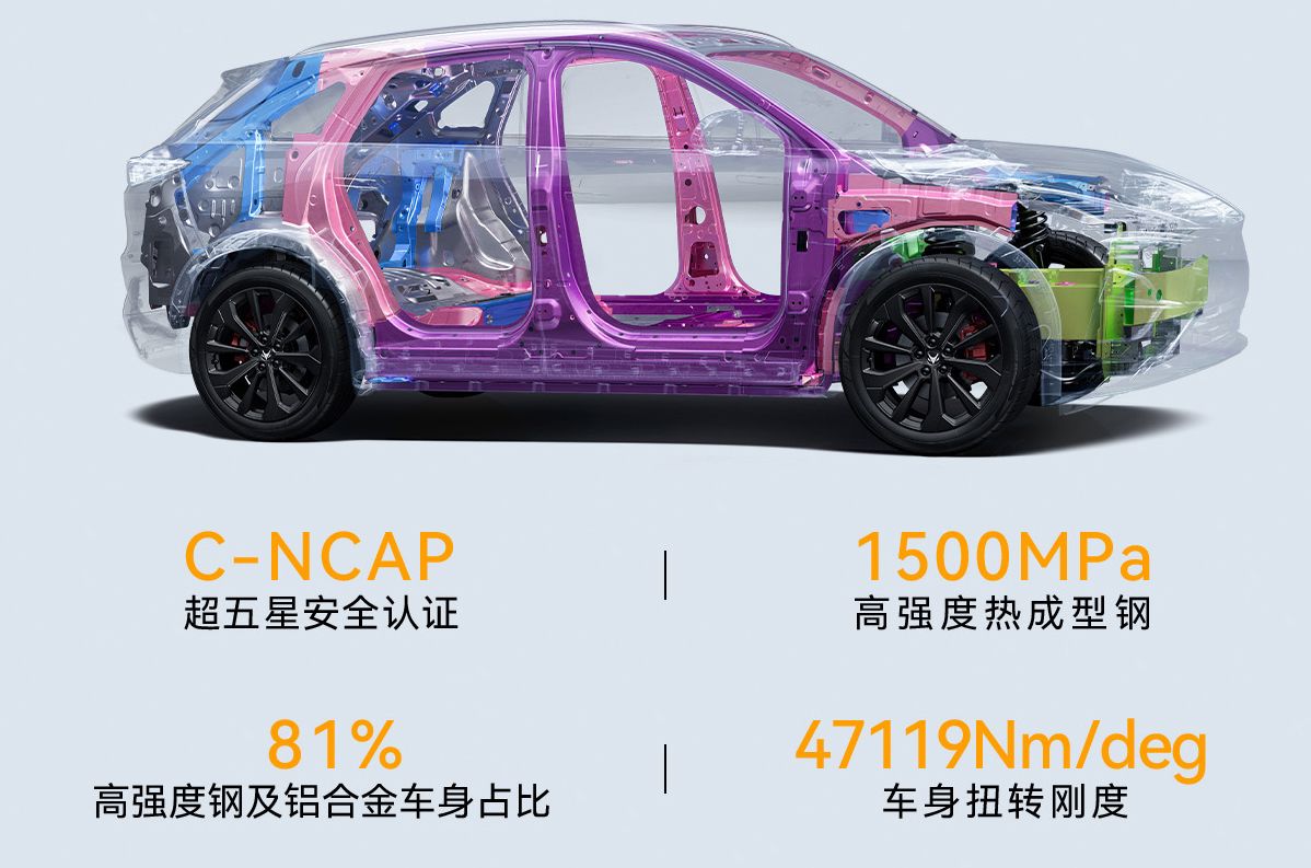 新車車身扭轉剛度達到了47119N·m/deg,上車體大比例采用高強度鋼及超高強熱成形鋼,使用最高強度為1500MPa的熱成形材料,下車體采用鋁合金結構。全車高強度鋼和鋁合金車身占比高達81%。