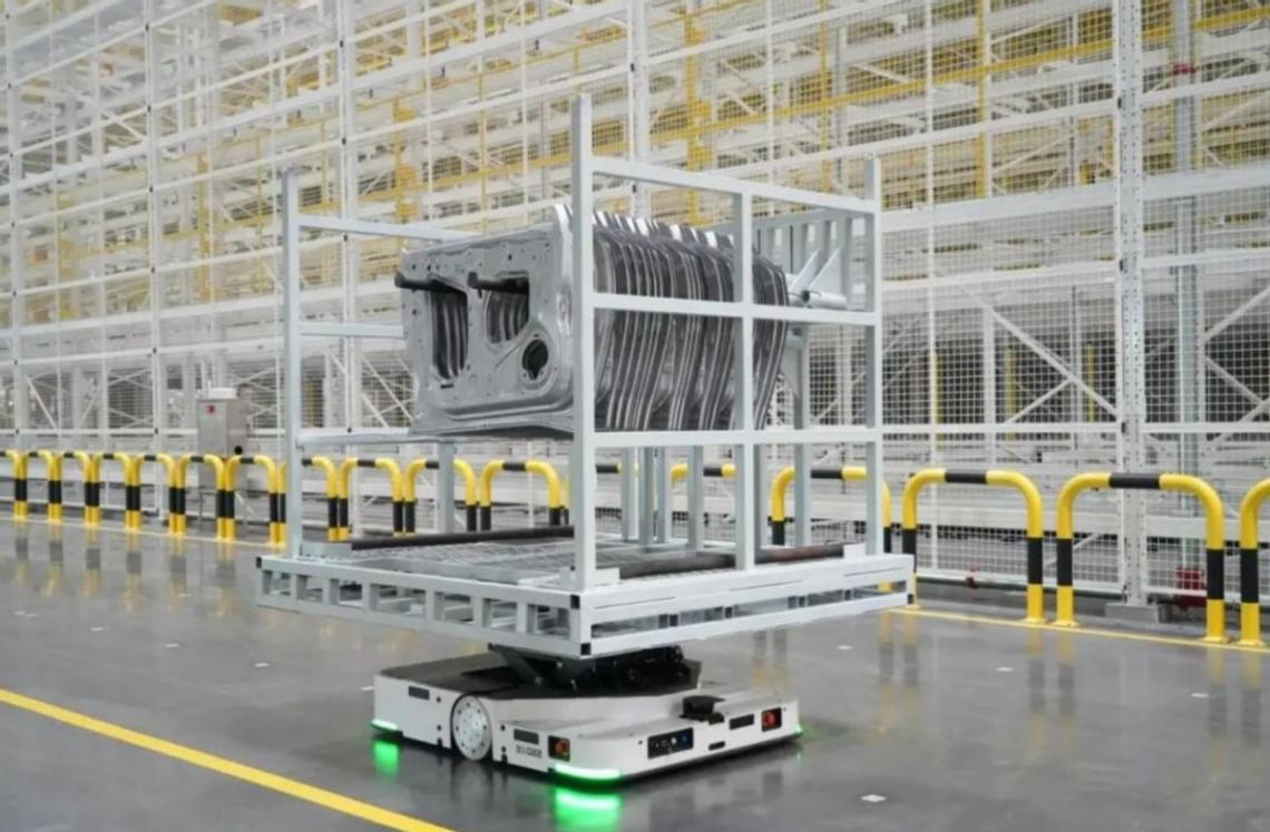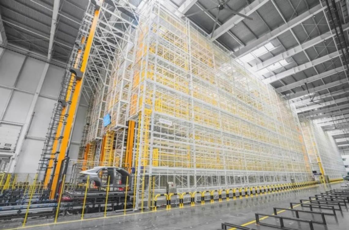 零件生產完成后由機器人完成100%自動裝箱,并通過AGV將沖壓件準確運送到智能立體倉庫。倉庫有7層樓高、約6.5個籃球場大,通過與生產系統的智能對接,可完成零件自動出庫及AGV自動配送,實現從沖壓線末到焊裝車間100%自動化無人物流。