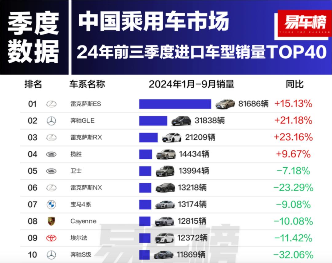 前段時間,下面這張銷量圖在汽車圈廣為傳播。在今年前三季度進口車型銷量榜中,雷克薩斯ES以8.16萬臺的成績穩居榜首,論數量是第二名的兩倍之多,論增幅也名列前茅,增長態勢十分強勁。