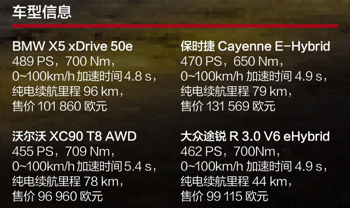 在這里,有關豪華SUV的討論都頗具話題性?不信的話就把BMW X5、保時捷Cayenne、沃爾沃XC90和大眾途銳都請到法國首都來吧。在巴黎,你會發現每小時的停車費至少是18歐元,因為收費是根據重量計算的,而這四輛插電式混合動力汽車的重量都在2.5噸左右。這也難怪,畢竟這四輛SUV都搭載了兩個驅動裝置和沉重的電池組。但好在它們的動力表現又使得整體重心得以平衡,因此至少在455馬力的系統輸出功率和650牛·米的系統扭矩下給人一種輕盈的駕駛感覺。畢竟,它們可以僅用純電驅動就能從東向西或者從北向南穿過這座可能是全世界最小的國際大城市。